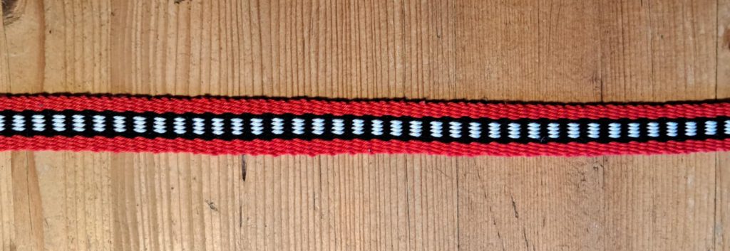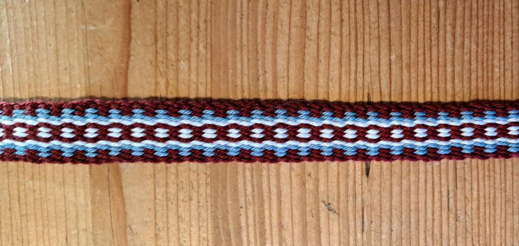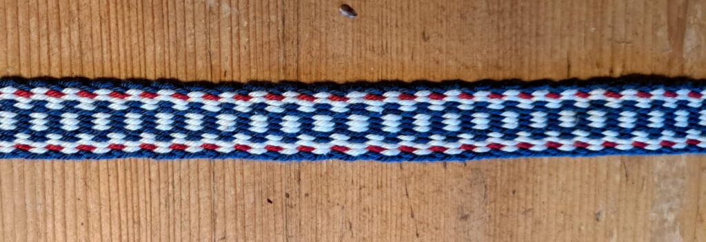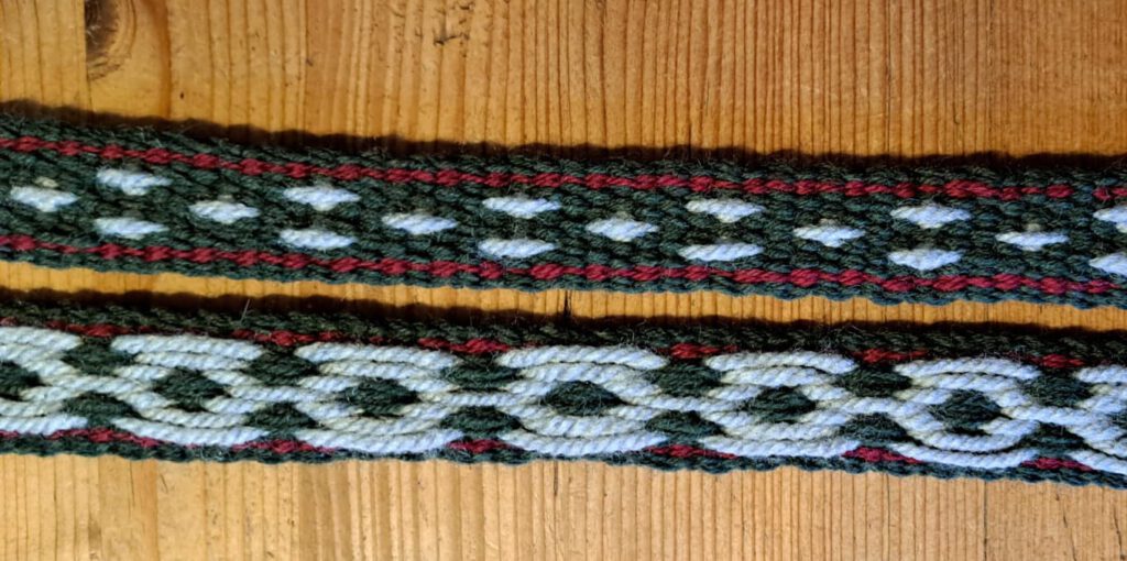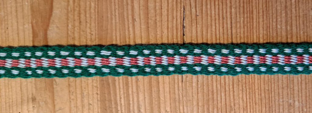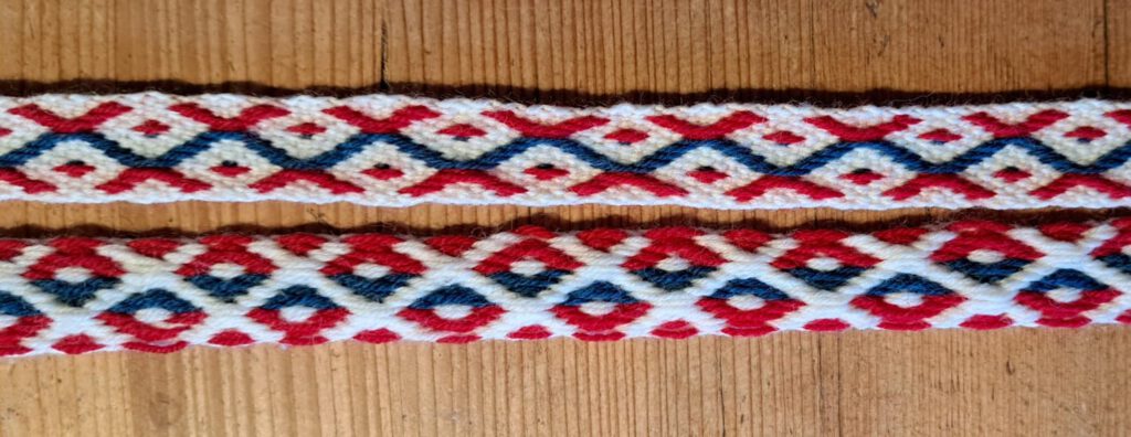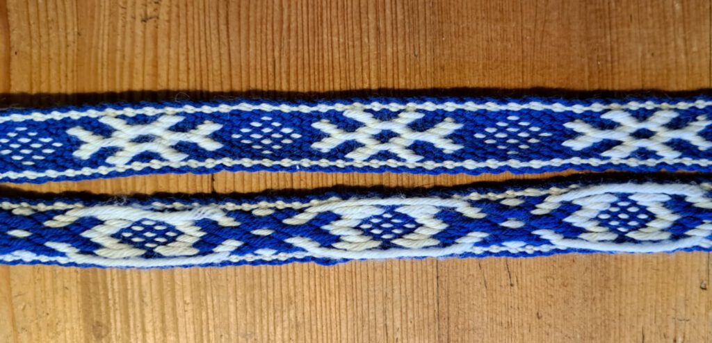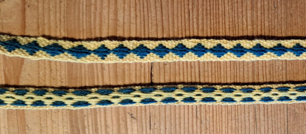 Bei der anderen Methode werden nur zwei Farben verwendet, eine Musterfarbe und eine Grundfarbe, wobei die Faden der Musterfarbe entweder nach oben gezogen oder nach unten gewebt wird. So entsteht das Muster. Hierbei kann man mit 5, aber auch mit über 30 Musterfäden arbeiten. Alle hier gezeigten Muster können zu langen oder kürzeren Bändern gewebt werden, je nach Wunsch. Auch die Farbe kann ausgesucht werden. Am liebsten webe ich mit Baumwolle, aber auch Wolle ist möglich. Falls Sie ein Band passend zu einem Arbeitsstück brauchen, können Sie mir die Wolle schicken und ich fertige für Sie das passende Band.