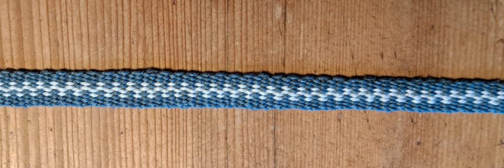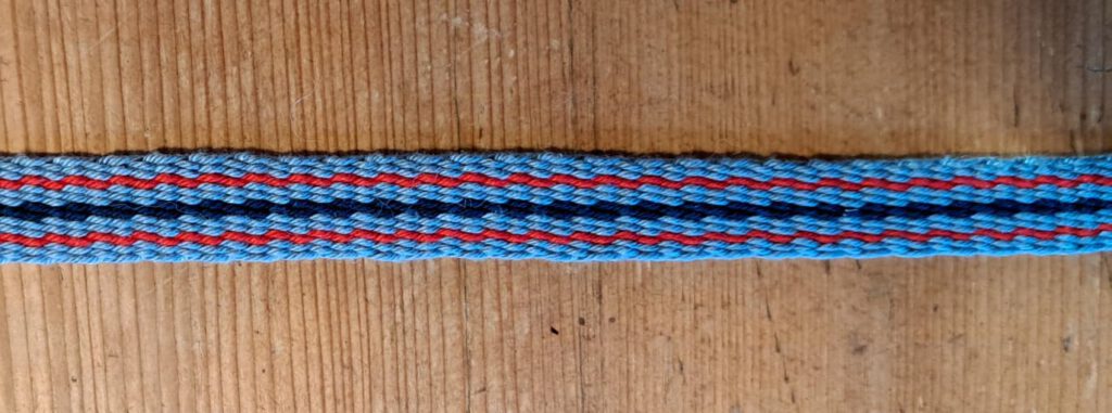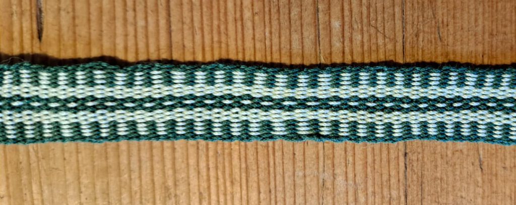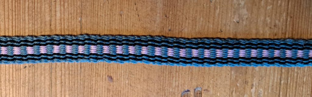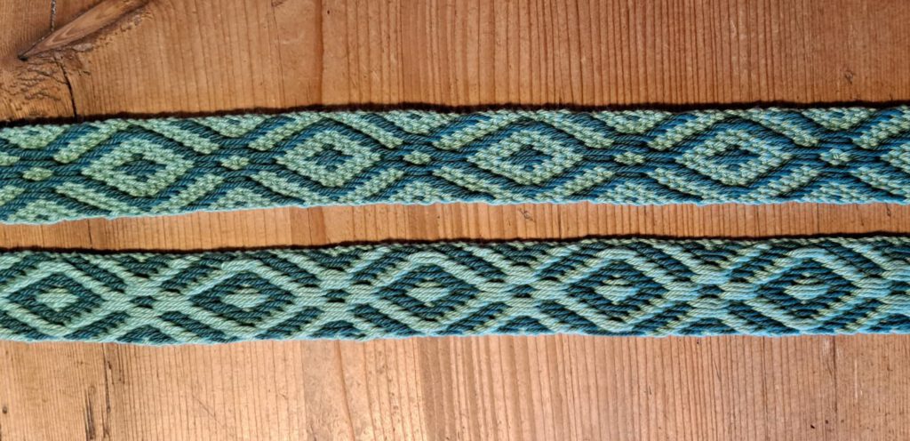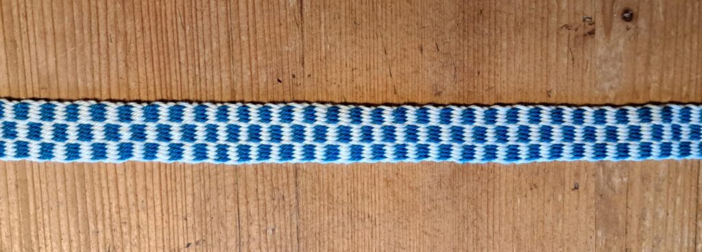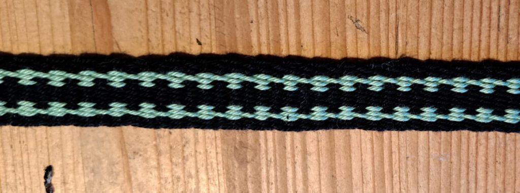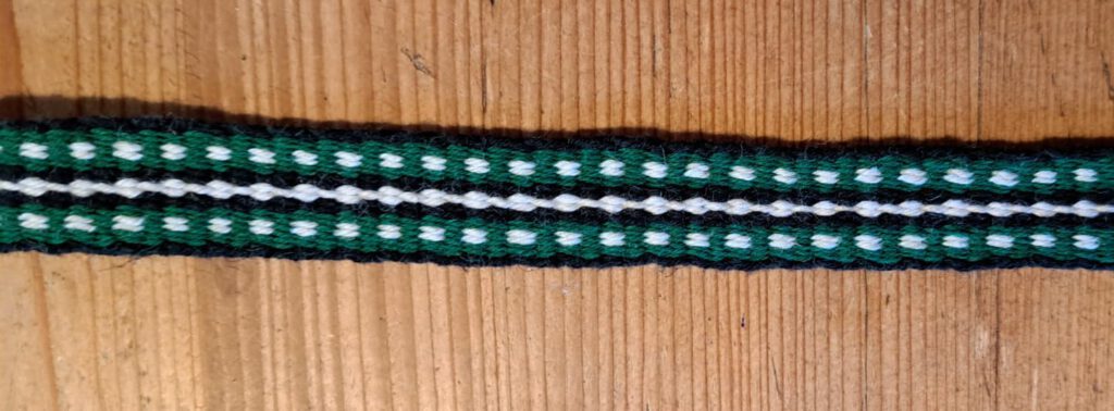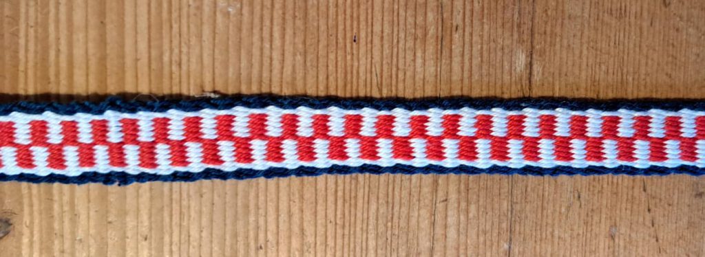 Bei der anderen Methode werden nur zwei Farben verwendet, eine Musterfarbe und eine Grundfarbe, wobei die Faden der Musterfarbe entweder nach oben gezogen oder nach unten gewebt wird. So entsteht das Muster. Hierbei kann man mit 5, aber auch mit über 30 Musterfäden arbeiten. Alle hier gezeigten Muster können zu langen oder kürzeren Bändern gewebt werden, je nach Wunsch. Auch die Farbe kann ausgesucht werden. Am liebsten webe ich mit Baumwolle, aber auch Wolle ist möglich. Falls Sie ein Band passend zu einem Arbeitsstück brauchen, können Sie mir die Wolle schicken und ich fertige für Sie das passende Band.