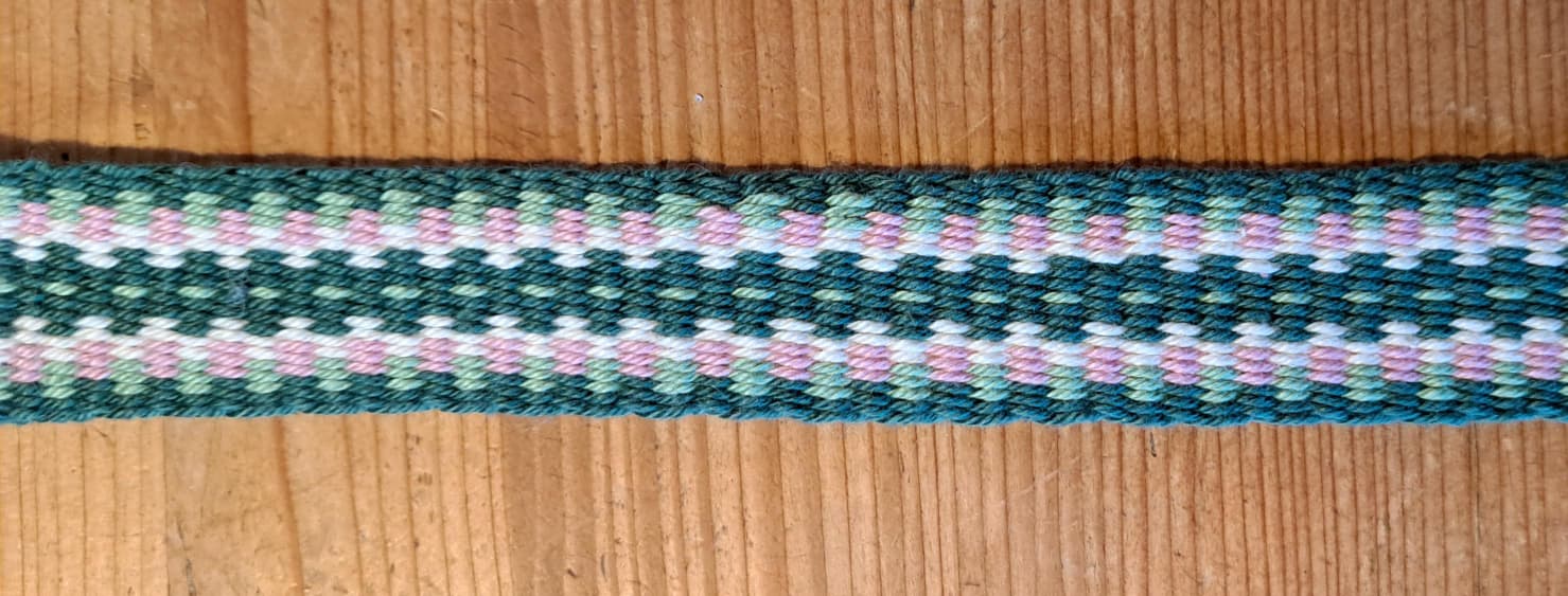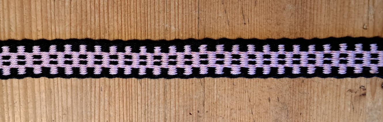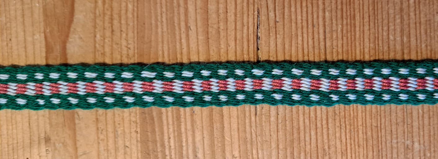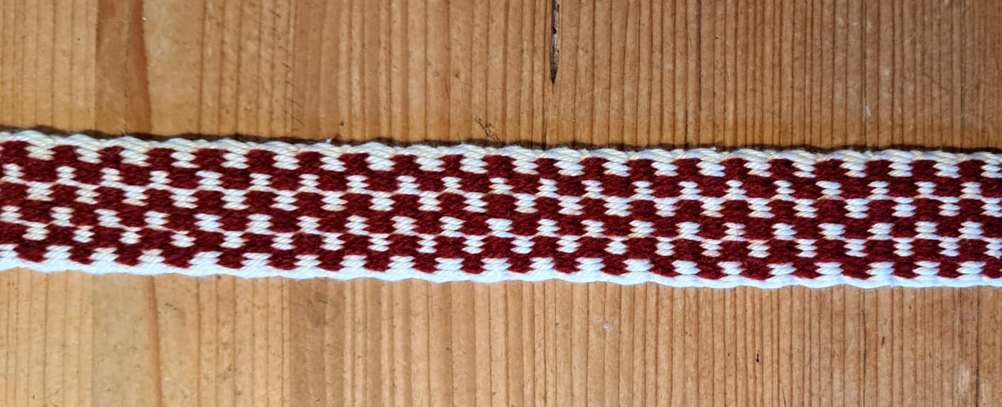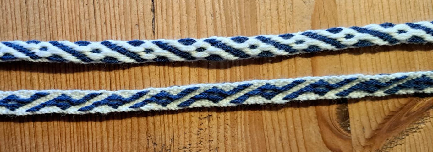 Bei der anderen Methode werden nur zwei Farben verwendet, eine Musterfarbe und eine Grundfarbe, wobei die Faden der Musterfarbe entweder nach oben gezogen oder nach unten gewebt wird. So entsteht das Muster. Hierbei kann man mit 5, aber auch mit über 30 Musterfäden arbeiten. Alle hier gezeigten Muster können zu langen oder kürzeren Bändern gewebt werden, je nach Wunsch. Auch die Farbe kann ausgesucht werden. Am liebsten webe ich mit Baumwolle, aber auch Wolle ist möglich. Falls Sie ein Band passend zu einem Arbeitsstück brauchen, können Sie mir die Wolle schicken und ich fertige für Sie das passende Band.