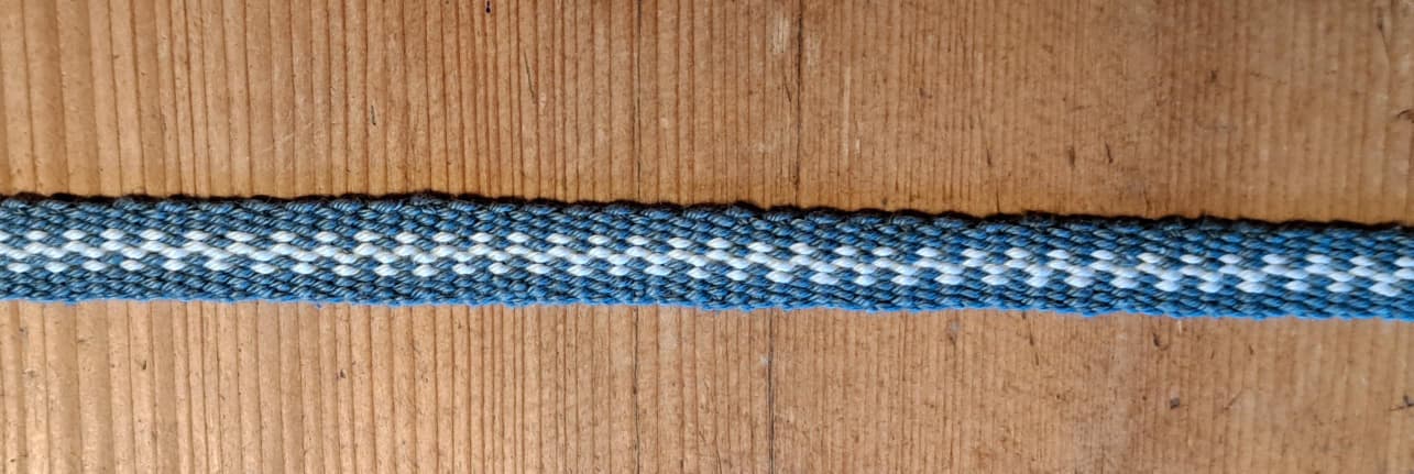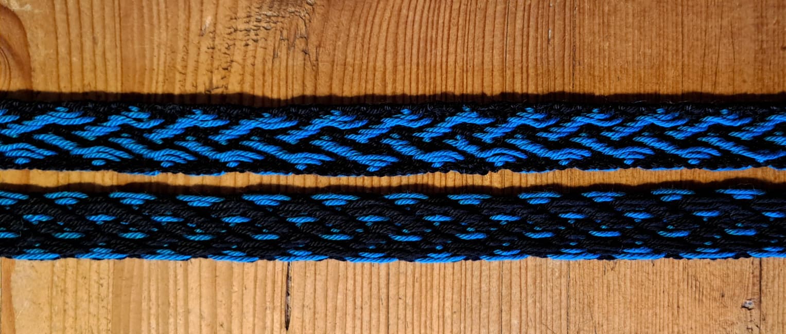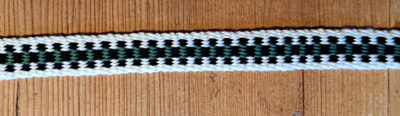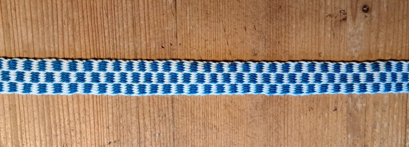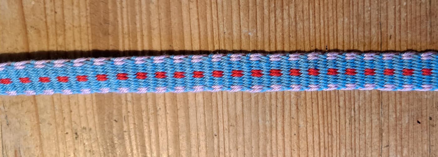 Bei der anderen Methode werden nur zwei Farben verwendet, eine Musterfarbe und eine Grundfarbe, wobei die Faden der Musterfarbe entweder nach oben gezogen oder nach unten gewebt wird. So entsteht das Muster. Hierbei kann man mit 5, aber auch mit über 30 Musterfäden arbeiten. Alle hier gezeigten Muster können zu langen oder kürzeren Bändern gewebt werden, je nach Wunsch. Auch die Farbe kann ausgesucht werden. Am liebsten webe ich mit Baumwolle, aber auch Wolle ist möglich. Falls Sie ein Band passend zu einem Arbeitsstück brauchen, können Sie mir die Wolle schicken und ich fertige für Sie das passende Band.